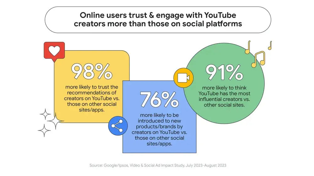 Contemporary users show a pronounced preference for varied content on platforms like YouTube, with 90% exploring different content types from their favored creators within a year. Highlighting the trust factor, YouTube’s user engagement rate doubles compared to other traditional social platforms.