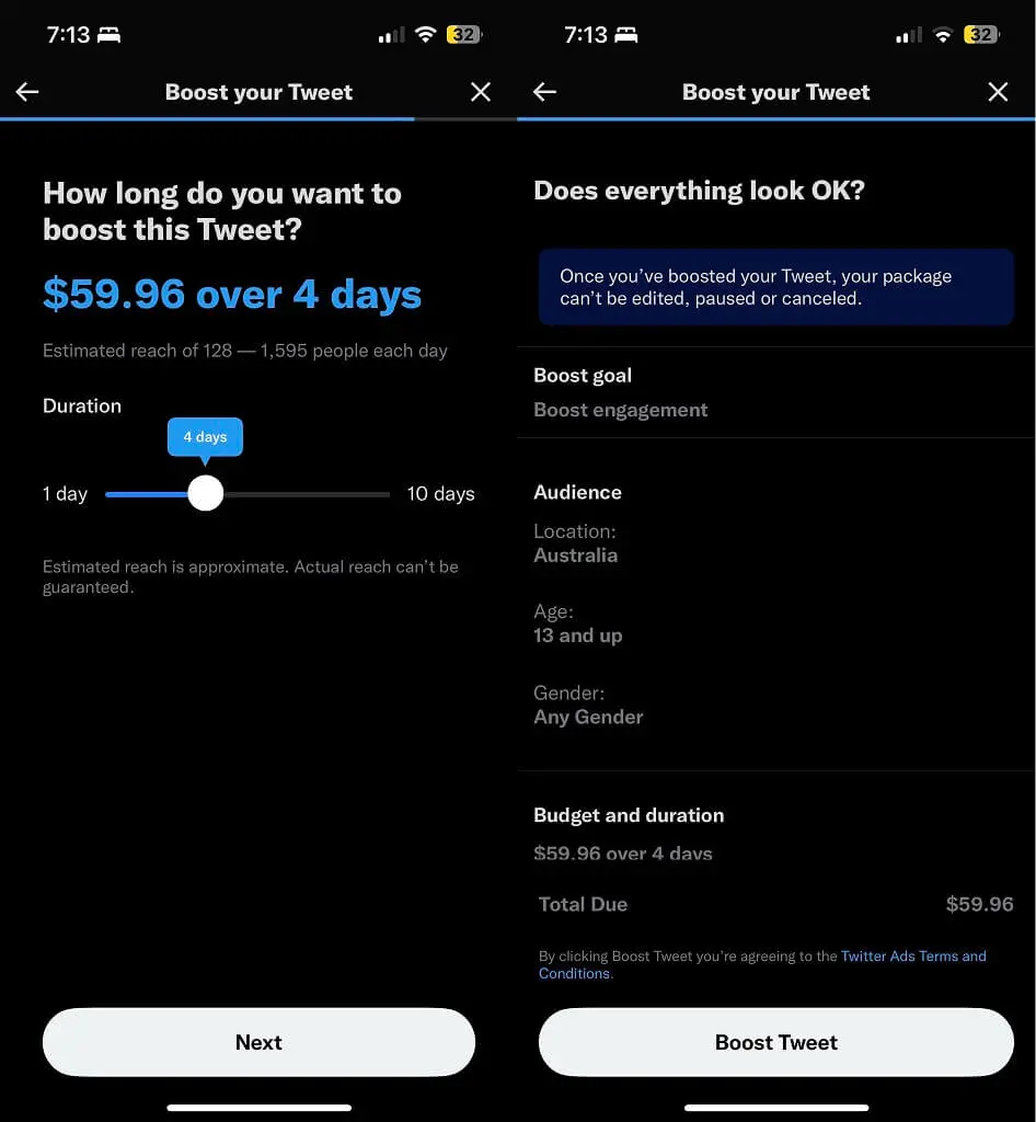 The new boosting feature for tweets shared by Jonah Manzano would be accessible from within the tweet itself. You can simply tap, select your own budget for the boost, choose your audience, and then you can confirm your selection.